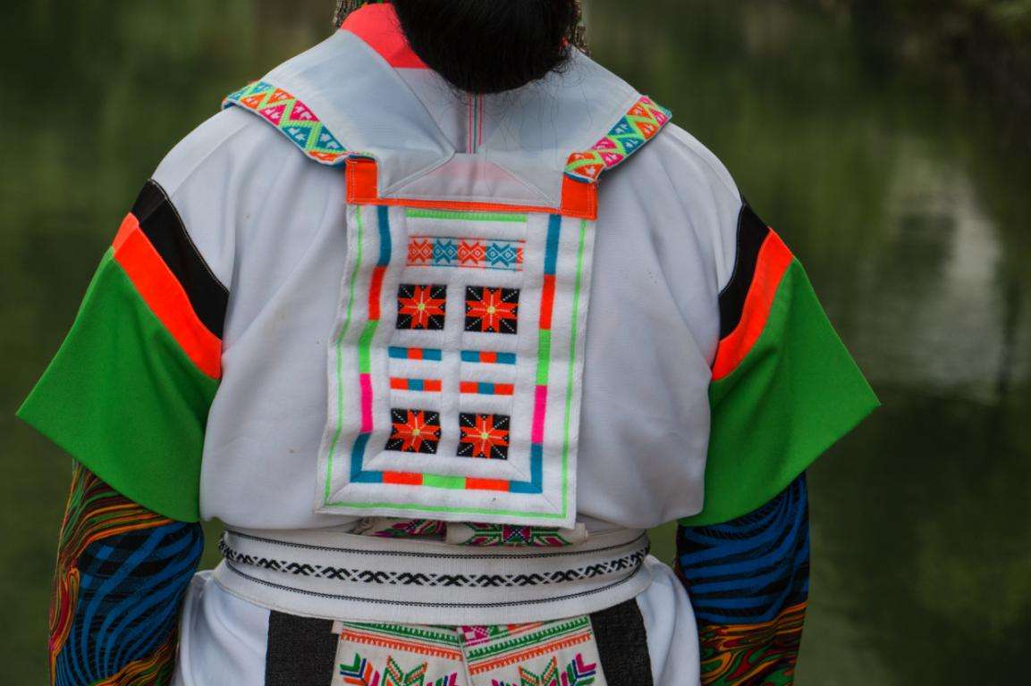 改毛村苗族村民的傳統(tǒng)服飾至今保留完好,而且現(xiàn)在村內(nèi)的苗族人都還有穿著本民族傳統(tǒng)服飾的習(xí)慣。改毛村的苗族男性一般頭戴黑色絲帕裹成的帽子,絲帕里裹有彩色絲巾。穿著藍色打底的斜襟長衫,腰部系有綠色腰帶。