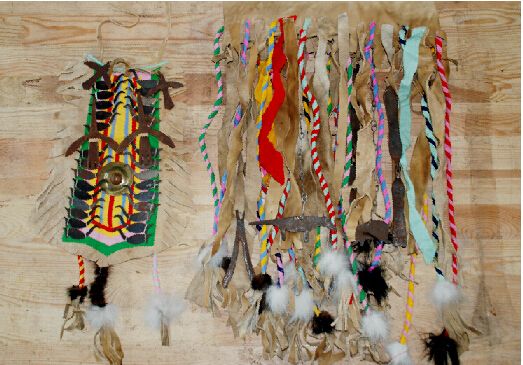 腰裙下擺的前后配戴著50個銅鈴,以此代表眾多神靈的福音。腰裙上還系著一對熊神和一對狼神偶體,因?yàn)槎鯗乜巳苏J(rèn)為熊是人類的祖先,人們不能輕易傷害獵取,如果一旦打死熊,也要對熊骨進(jìn)行風(fēng)葬。而狼據(jù)說是神靈的兒子。這些又都可見薩滿信仰又與鄂溫克人在原始社會條件下的自然崇拜、祖先崇拜有著非常緊密的淵源關(guān)系。
