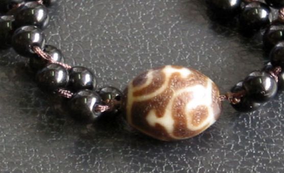 天珠色澤愈是溫潤帶油脂般光華,顏色愈是白中帶乳,價值愈高;一般不透明的通常比透明的有價值,透明的常見于線珠或紅玉髓珠,有眼的天珠較少見。風(fēng)化紋,老天珠上常見到一圈一圈的凹陷小圓圈,這即是風(fēng)化紋,通常是老天珠比較多見到此類的紋路,一般愈珍貴的西藏天珠,無論在色澤或紋路上,皆須具有溫潤與顏色分明。西藏天珠常見的顏色有黑、白、乳白、象牙白、咖啡色、紅色等。天珠會因佩戴者的不同而產(chǎn)生不同的變化,一般佩戴者可親眼看到天珠的色澤越變越溫潤。