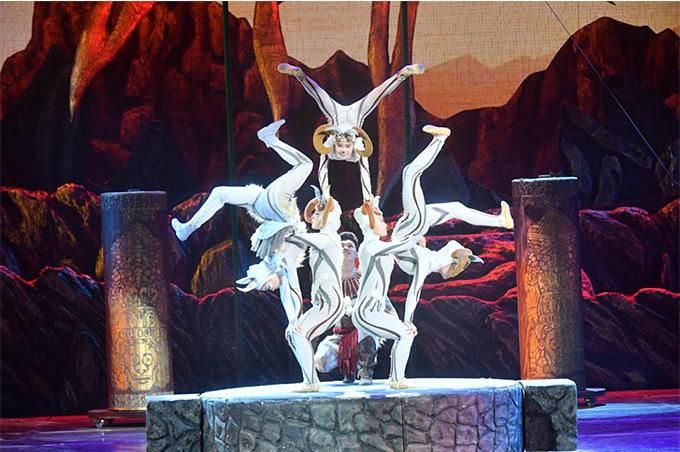 《巖石上的太陽》挖掘?qū)幭谋就廖幕夭?,以聞名于世的賀蘭山巖畫為創(chuàng)作主題,將非物質(zhì)文化遺產(chǎn)用雜技藝術(shù)的形式再現(xiàn)出來,填補(bǔ)了寧夏歷史上大型原創(chuàng)雜技劇的空白。