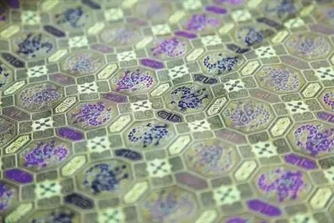 菱格四合如意紋錦根據(jù)民間收藏家手中的傳世品復(fù)制,通過分析測(cè)試原作的花紋色彩、絲線材料、織物結(jié)構(gòu)及加工工藝,并采用手工彩拋換道,使整匹面料的色彩千變?nèi)f化。