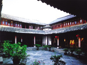 云南大理市喜州“四合五天井”院落。白族將一幢三開間二層的房屋稱為“一坊房子”。一坊房子是普通百姓最常見的住房,即底層三間一明兩暗,明間為堂屋,安設六扇花格門。兩側(cè)次間為臥室,設單扇門和格扇窗,前面有臺階和寬敞的廈廊。樓上三間敞通,一般不隔間,依房柱分區(qū)域,面對天井設格扇窗。中間明間靠后墻設神龕,里間當書房,放書柜和書桌,人口多的也放床當臥。