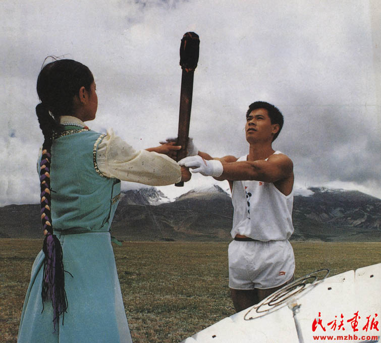 1990年,象征著亞洲30億人民“團(tuán)結(jié)、友誼、進(jìn)步”的第十一屆亞洲運(yùn)動(dòng)會(huì)在中華人民共和國(guó)首都北京隆重開(kāi)幕。8月7日,在西藏的念青唐古拉峰下,藏族少女達(dá)娃央宗點(diǎn)燃火把,傳遞給前世界冠軍、“體操王子”李寧(壯族),李寧接過(guò)圣火,點(diǎn)燃了火種盒內(nèi)的火種《民族畫(huà)報(bào)》1990年第11期
