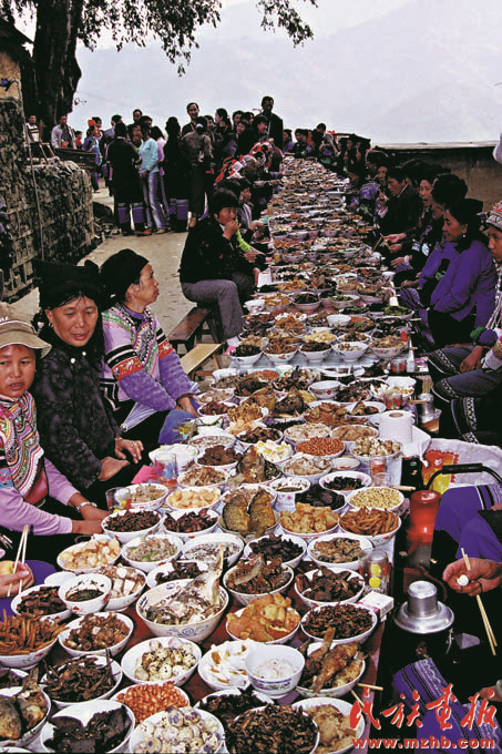 經(jīng)過(guò)近30年的改革開(kāi)放,各族人民的生活發(fā)生了翻天覆地的變化。圖為2005年哈尼族在年節(jié)時(shí)擺的長(zhǎng)街宴,席間有許多民族特色佳肴。最長(zhǎng)的云南紅河州綠春縣的長(zhǎng)街宴在2004年被載入世界吉尼斯紀(jì)錄《民族畫(huà)報(bào)》2005年第2期
