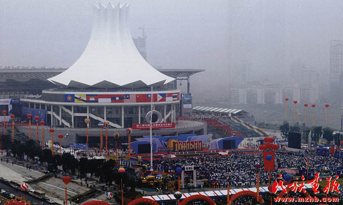 2004年,中國(guó)—東盟博覽會(huì)開(kāi)始舉辦。15年來(lái),中國(guó)—東盟博覽會(huì)承載促進(jìn)雙向交流合作的重要使命和催生多贏局面的美好愿景,推動(dòng)中國(guó)—東盟經(jīng)貿(mào)合作邁進(jìn)新時(shí)代。圖為2005年第二屆中國(guó)—東盟博覽會(huì)開(kāi)幕式?!睹褡瀹?huà)報(bào)》2005年第12期