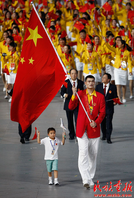 2008年8月8日,全國(guó)各族人民期盼已久的第二十九屆奧林匹克運(yùn)動(dòng)會(huì)在北京隆重開(kāi)幕,圖為北京奧運(yùn)會(huì)中國(guó)代表團(tuán)入場(chǎng)儀式上,運(yùn)動(dòng)員姚明領(lǐng)著汶川大地震中最小的救人英雄林浩入場(chǎng)?!睹褡瀹?huà)報(bào)》2008年第9期