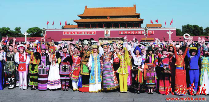新中國(guó)成立以來(lái),黨和國(guó)家始終堅(jiān)持把馬克思主義民族理論同中國(guó)民族問(wèn)題具體實(shí)際相結(jié)合,始終堅(jiān)持把民族工作作為一項(xiàng)重大工作來(lái)抓,團(tuán)結(jié)帶領(lǐng)全國(guó)各族人民共同團(tuán)結(jié)奮斗,共同繁榮發(fā)展,開(kāi)創(chuàng)了中國(guó)特色解決民族問(wèn)題的正確道路,取得了舉世矚目的成就,積累了彌足珍貴的成功經(jīng)驗(yàn)。2009年10月1日,在北京天安門廣場(chǎng),20萬(wàn)軍民以盛大的閱兵儀式和群眾游行歡慶新中國(guó)60華誕,圖為各民族學(xué)生參加“團(tuán)結(jié)奮進(jìn)”方陣群眾游行?!睹褡瀹?huà)報(bào)》2009年第10期
