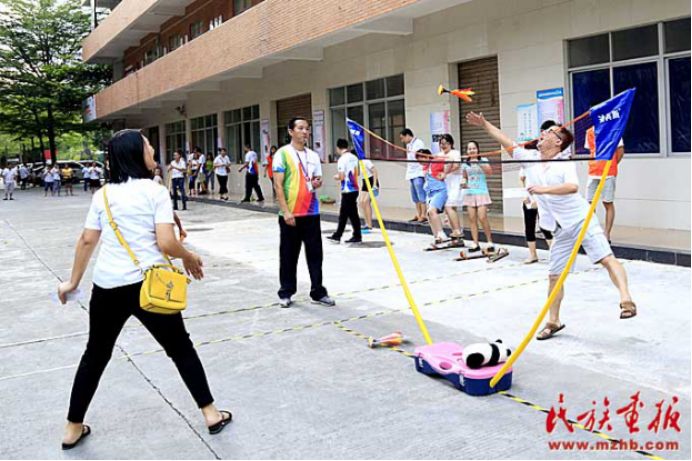 趣味運動會結合民族地區(qū)開展的傳統(tǒng)體育項目,以及趣味競技游戲等,展示了少數(shù)民族傳統(tǒng)體育特色,如盲敲銅鑼和高蹺便是利用了民族地區(qū)的一些傳統(tǒng)活動改編而來的,另外還有團隊協(xié)作的民族民間運動項目手毽、拔河和板鞋競速等。200余名各族群眾參加了這些帶有濃厚民族特色的運動項目。