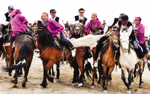 2014年5月2日,新疆克拉瑪依市在烏爾禾鄉(xiāng)舉辦了第三屆少數(shù)民族傳統(tǒng)體育運動會。在開幕式上,數(shù)萬名各族市民和農(nóng)牧民觀看了克拉瑪依市千余名各族退休職工表演的大型健身操。300余名來自維吾爾族、哈薩克族、蒙古族等民族的運動員,參加了賽馬、叼羊、姑娘追、摔跤等活動。圖為叼羊比賽現(xiàn)場。