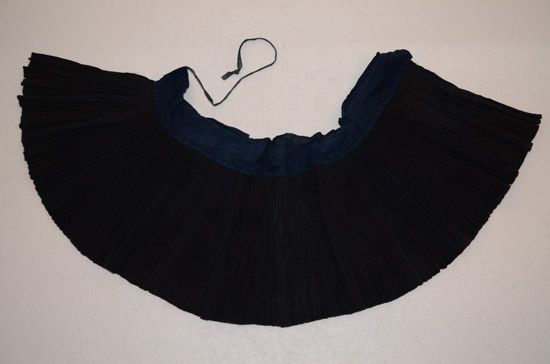裙子為家織土布,青色細褶裙。圍腰中部為織,所繡圖案為魚紋、鳳鳥紋和“蝴蝶媽媽”、“人騎馬”等組合而成的幾何紋。