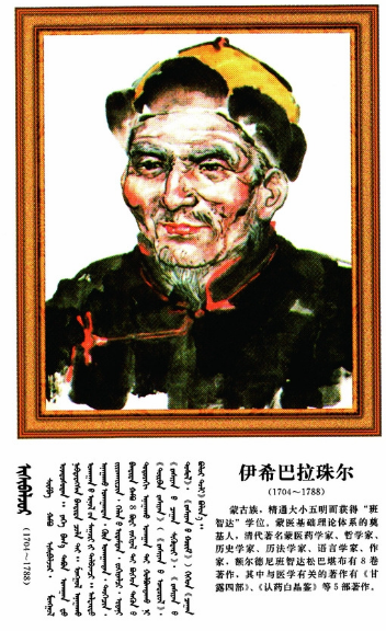 簡介:伊希巴拉珠爾(1704~1788),蒙古族,一名也協(xié)班覺、額爾德尼班智達·松巴堪布,蒙古衛(wèi)拉特人,著名蒙醫(yī)學家、文學家、天文學家、哲學家。一生著作豐厚,其中對完善蒙醫(yī)理論體系有重要影響的著作有《甘露之泉》、《白露醫(yī)法從新》、《甘露點滴》、《甘露匯集》和《認藥水晶鑒》[詳細]