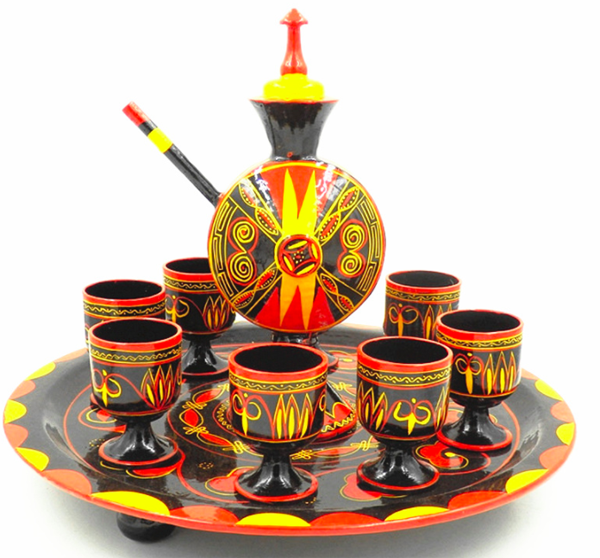 彝族漆器種類很多,僅餐飲具就有餐桌、飯盤、肉盤、湯缽、大小碗、勺、舀酒瓢等;酒具,有酒壺、酒杯等。民族風(fēng)格特別突出的是鷹爪杯、雁爪杯、牛角杯和野豬蹄杯等飲酒器皿。鷹、野豬等都是很兇猛的禽獸,用兇猛動物身上的材料做酒杯,標(biāo)志著主人的靈巧與勇猛。他們認(rèn)為戰(zhàn)勝了靈巧與兇猛的東西,其本身就更靈巧與勇猛。