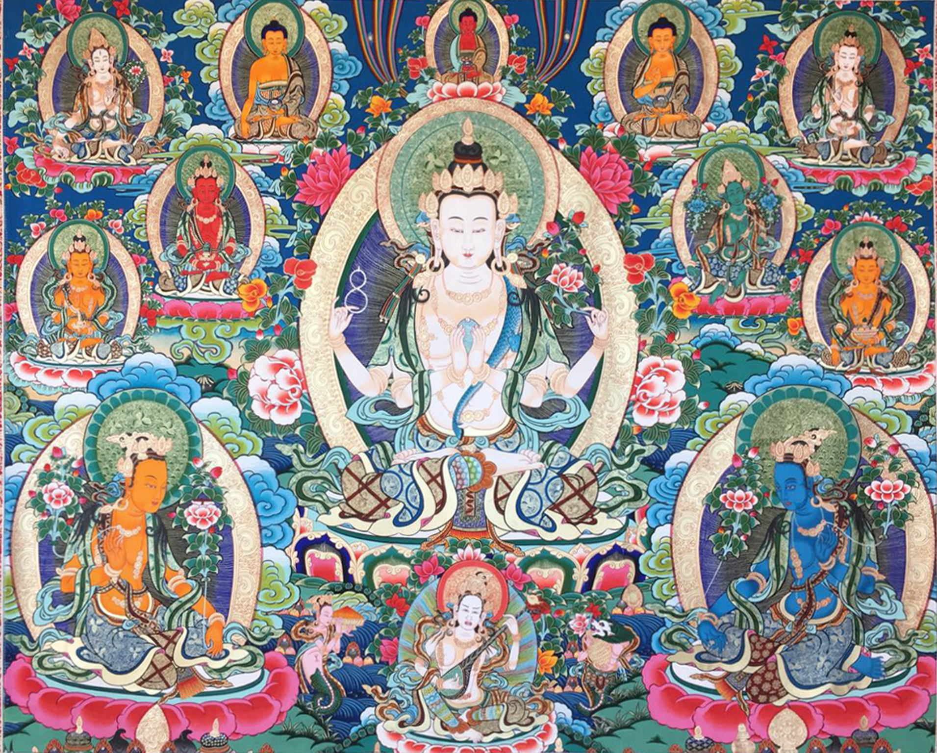 四臂觀音一面四臂,慈悲善良,頭戴五佛冠,身穿輕柔天衣,坦胸露腹,戴著珍寶耳環(huán)、珍寶項鏈、珍寶瓔珞,第一雙手之右手持水晶念珠,左手持八瓣蓮花;第二雙手當胸合掌,雙足跏趺于蓮花寶座中央,身后有光環(huán)、祥云、遠山。