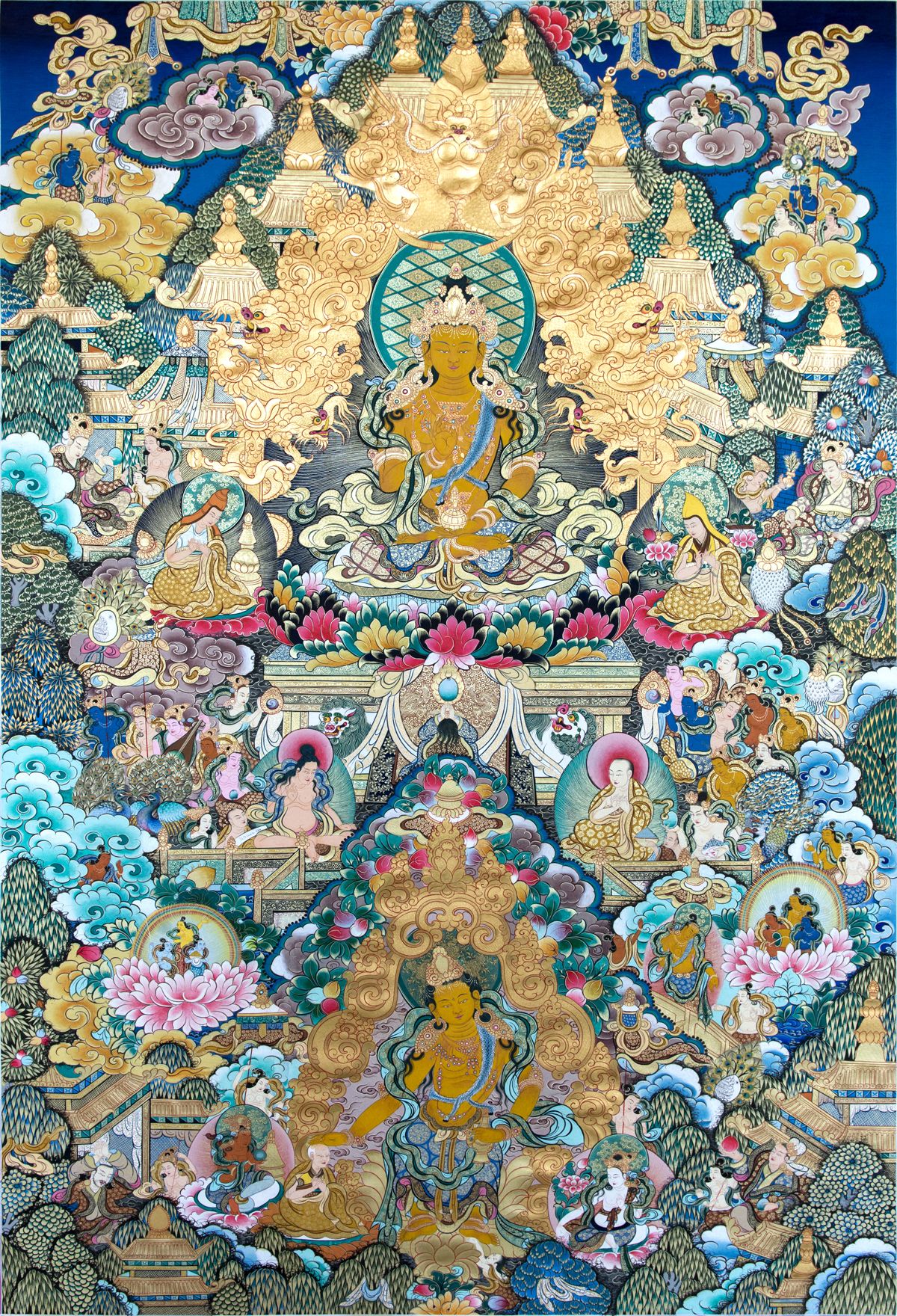 主尊未來(lái)世界彌勒佛菩薩,左邊描繪了噶當(dāng)派創(chuàng)世者阿底峽尊者與他的弟子。右邊描繪了格魯派的創(chuàng)世者宗喀巴大師與兩大弟子克主杰和迦側(cè)杰,中部周圍供奉者八大隨喜菩薩文殊菩薩、普賢菩薩、觀世音菩薩、金剛手菩薩、虛空藏菩薩、地藏菩薩、彌勒菩薩、除蓋障菩薩,畫面四角供奉為彌勒佛未來(lái)世界的迎接與弘揚(yáng)佛法的情景。畫面上空描繪了仙女四處飛揚(yáng),空中漂浮著吉祥的圖案與神秘的瑞相等等。整體畫完之后選擇一個(gè)殊勝吉祥的日子點(diǎn)所有諸佛的五官,發(fā)髻、手勢(shì)、法器、畫面后部畫家要親自寫聲、語(yǔ)、法的字號(hào)。作品完工之后寺院里進(jìn)行眾多活佛和高僧大德的加持與開光儀式。