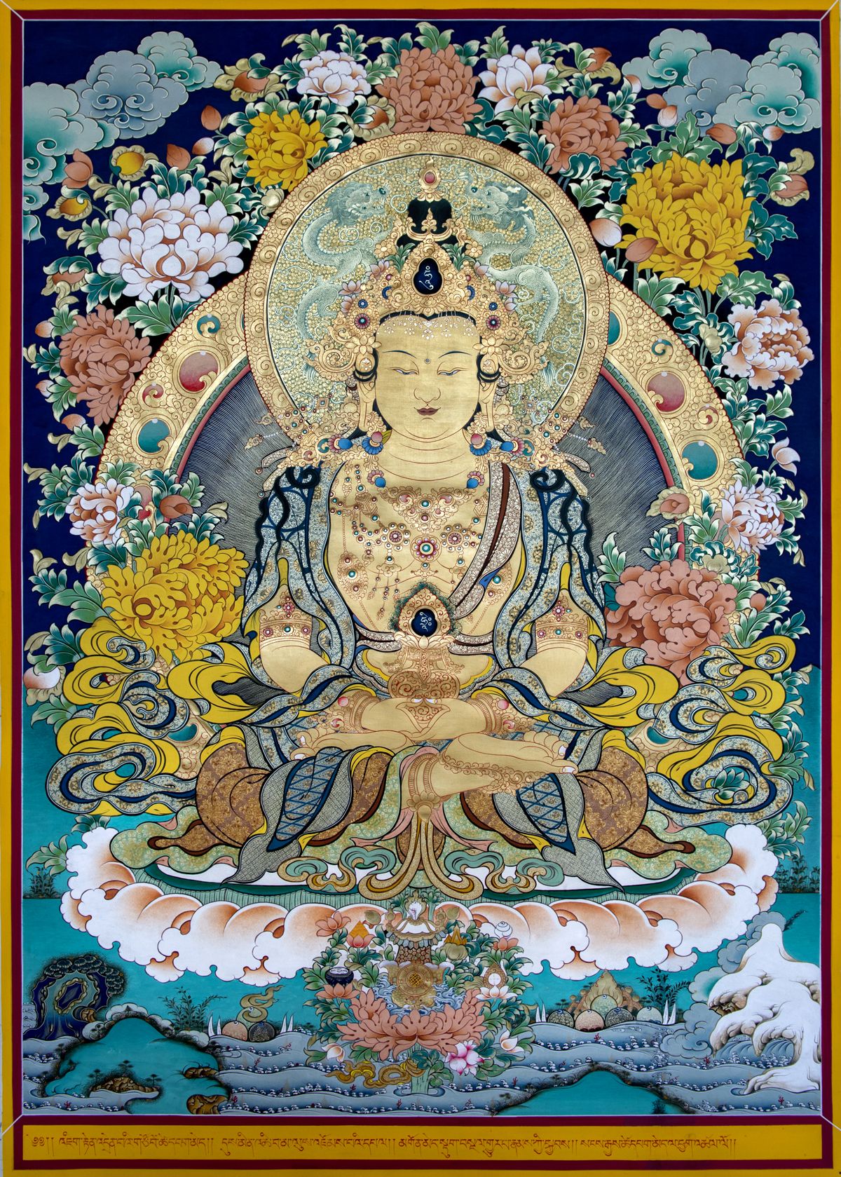 長壽佛(梵名Aparimita āyur jnāna su-vinisˊicita tejo rājāya tathāgata),在漢譯佛經(jīng)中無其形象之記載描述,藏傳佛教中其畫像為一面二臂,肌膚紅色,盤發(fā)成髻戴五佛寶冠,上穿天衣,下著綢裙,身佩珍寶瓔珞,具足一切報身佛的種種莊嚴(yán),雙手結(jié)禪定印于膝上,托長壽寶瓶,雙足以金剛雙跏趺安住于蓮花月輪上。