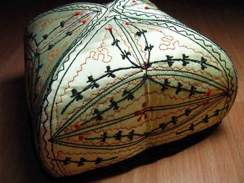 新疆兄弟民族的帽子,顏色、帽形是多種 多樣的,最典型的是維吾爾人的綠花帽。它是用手工、絲線繡上花葉圖案的四方棱形的花帽,繡工精致,花葉紋樣富有裝飾美。顏色有綠、紅、黃、黑、白。有單色的,也有無色交織的、黑白相間的。這種花帽,男女老少都愛戴,但顏色花樣有所不同。男士戴的多繡花,婦女戴的不但繡花,而且在花紋中鑲上玻璃珠子或碎玉石片。