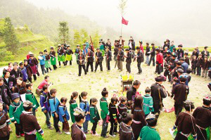 銅鑼、八仙、蘆笙一齊奏起的時(shí)候,“招龍”儀式正式開始。只見幾位身著長袍馬褂的寨老帶著全寨男女老幼威風(fēng)凜凜地列隊(duì)走向蛙公,然后列隊(duì)站在招龍師的身后,聽招龍師唱詞。祭師大喊3聲“保寨蛙公龍神君,請(qǐng)回來吧”!全部參加人員用苗語喊“保寨蛙公龍神君,請(qǐng)回來吧”!蒼涼的這3聲長吼劃破了長空。接著請(qǐng)主事殺牲祭龍,最后大家就地聚餐,叫做“熱鬧蛙公”。