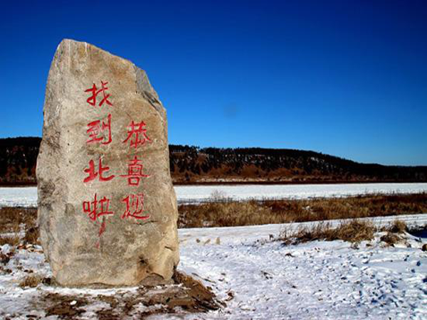 沿著形態(tài)各異的“北”字,可以走到中國(guó)最北端的廣場(chǎng)——北望埡口。“東經(jīng)122°20'43。48〃E北緯53°29'52。28〃N”的標(biāo)志就立在這里,旁邊一塊巨石上刻著“中國(guó)北極點(diǎn)”。