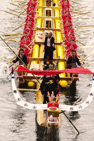 “苗族第一龍舟”全長(zhǎng)77.8米,寬2.5米,整舟由一條主舟與兩條子舟組合而成,主舟居中,子舟為輔船,組裝在主舟左右兩側(cè),兩條子舟分別長(zhǎng)58米。整船可承載槳手160人,舵手、鼓手、鑼手等共20人,總計(jì)180人。
