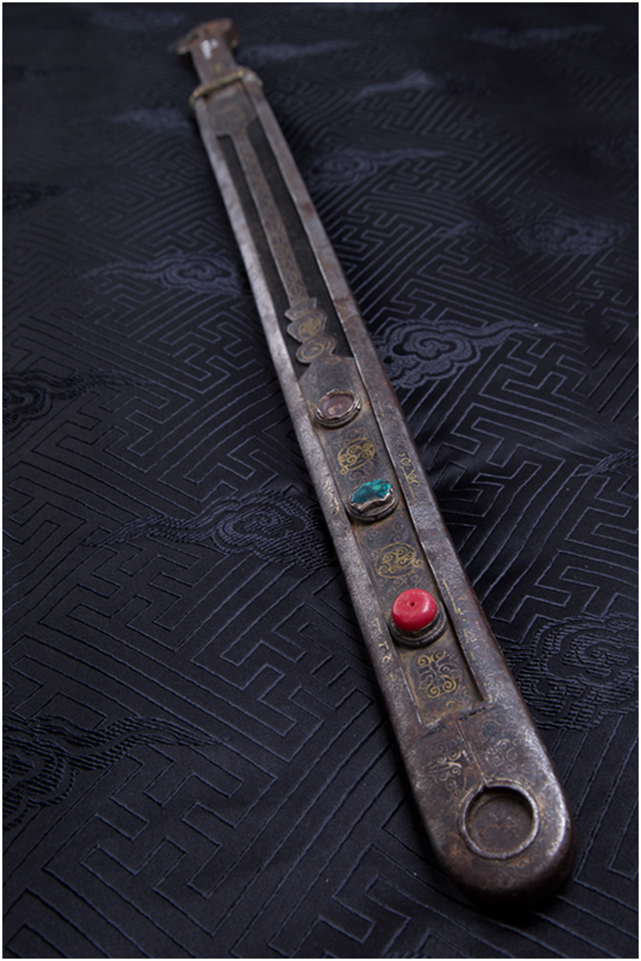 安多地區(qū)主要以放牧為主,牧民的刀主要用于宰殺和吃肉,有嚴(yán)格的男用女用之分,男式刀長(zhǎng)度在一尺以上,女式刀在一乍左右,刀鞘的底部和刀柄的末端上翹,呈船形。安多人喜歡珠寶,頭飾、胸飾、腰飾無(wú)不光燦耀人,這些飾物同樣被用在刀上,刀鞘和刀柄錨金錯(cuò)銀,鑲嵌著珊瑚和綠松石,像精美的藝術(shù)品。