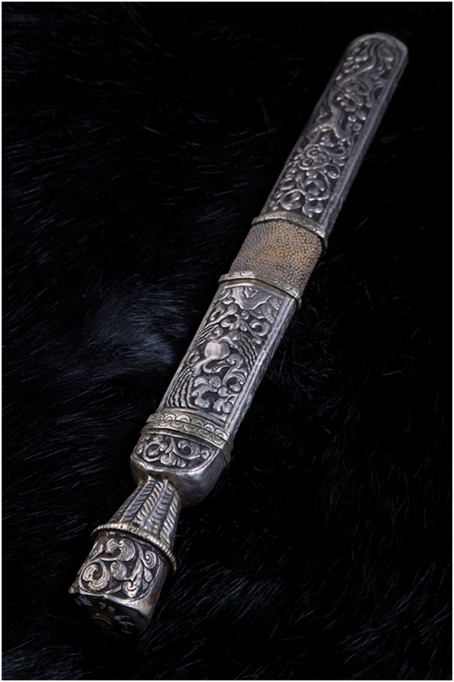 康區(qū)人性格粗獷豪放,刀對(duì)于他們來(lái)說(shuō),主要是戰(zhàn)斗的武器,他們愛(ài)刀勝過(guò)愛(ài)牛羊,一把好刀就是一筆財(cái)富,其形象也會(huì)因之而無(wú)形中高大起來(lái)。正因?yàn)槿绱耍麄儾粌H對(duì)刀本身有較高的要求,對(duì)其作為襯托武士氣概的刀的外在形制也有特殊的喜好。刀鞘材料一般使用黃、白銅或純銀,鑲珠嵌寶,正面雕龍畫(huà)鳳,背面線刻卷草,佩在身上,起到了美觀和威懾的雙重作用。