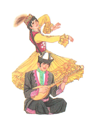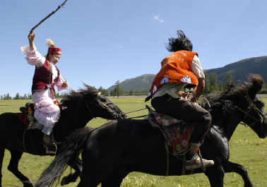 哈薩克族的傳統(tǒng)樂器可分為彈奏樂器、吹奏樂器以及打奏樂器。其中“冬不拉”、“薩孜”和“布特根”屬彈奏樂器;“斯伯孜俄”、“斯?fàn)柲且馈钡葘俅底鄻菲?;“達(dá)布拉”、“哈拉”等屬打奏樂器。無論是哪種類型的樂器無疑都將哈薩克族人民豪放灑脫,但又不失柔軟細(xì)膩的情感表現(xiàn)得淋漓盡致。哈薩克族的舞蹈剛健有力,瀟灑優(yōu)美,如“喀達(dá)卓日哈(黑走馬)”、“狗熊舞”、“鷹舞”、“擠奶舞”等都是反映哈薩克族人民日常生活的民族舞蹈。除歌曲、舞蹈以外,哈薩克族還有姑娘追、叼羊、賽馬等妙趣橫生的體育娛樂活動(dòng)。