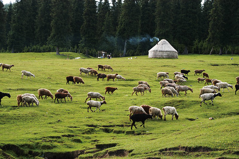 到了牧場,人們選有水有草的地方扎下帳篷。水與草是先祖?zhèn)冊诙嗄昵斑x擇生存地時的必要條件。水,可以供人畜飲用;草,可以供牛羊啃食。這時候,牧民們各自選一個地方將牛羊分開,讓它們在山野里去吃草。今年的草已經全部長出,牛羊們開始了又一次盛宴。