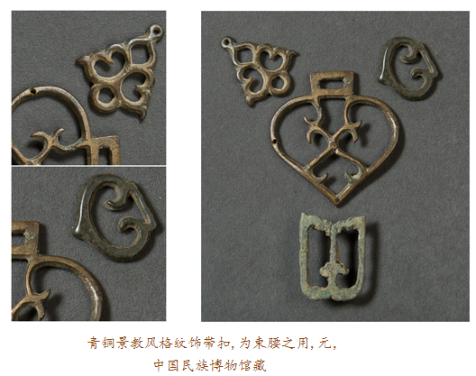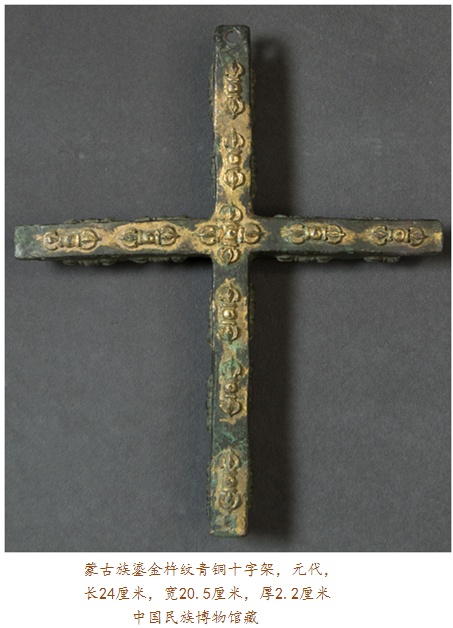 眼前此件在內(nèi)蒙古達(dá)茂旗出土的元代鎏金青銅十字架,四面排列有浮雕金剛杵紋,其正面每個金剛杵圖案上均有鎏金裝飾,十字架上部穿孔則可用于懸掛。金剛杵是藏傳佛教里的修行法器,象征力量與智慧;而十字架則是基督教文化的標(biāo)志,如此混搭,歷史便要傳遞出種種:在信仰藏傳佛教的蒙古高原,金剛杵,象征無畏圓滿,十字架,則代表救贖重生,東西方文化的結(jié)合亦呈現(xiàn)某種文明可能達(dá)到的無可比擬之高度。