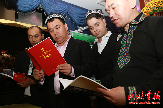 新疆美食城店主阿地力·買買提帶領維吾爾、哈薩克、回族等員工學習十九大報告