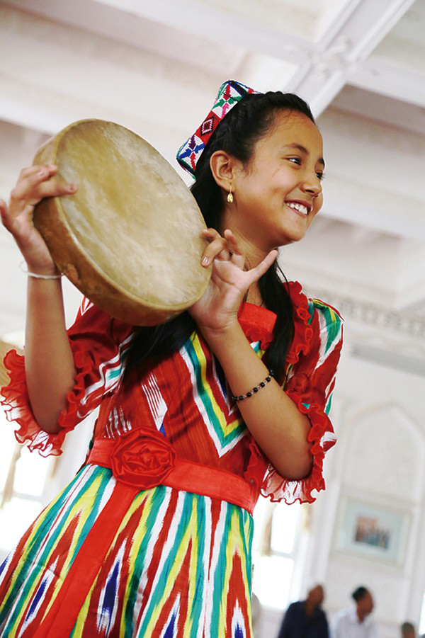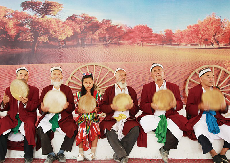 從麥迪娜9歲起教她達(dá)甫手鼓的是母親,把她打扮得漂漂亮亮的、去趕一場又一場麥西來甫的也是母親。作為央塔克鄉(xiāng)文化站站長,麥迪娜的母親整年都忙碌得要死。麥蓋提縣央塔克鄉(xiāng)以刀郎舞、農(nóng)民畫立鄉(xiāng),觀光者多,活動(dòng)多,任務(wù)多,接待多。它不僅是旅游之地,也是生活之地。麥迪娜的母親是位典型的維吾爾族女性,眉眼如刻,目光流轉(zhuǎn),婚后迅速發(fā)胖。在一大群女人當(dāng)中,她一定是最搶眼、最熱烈、最能干的那個(gè)。無論哪家舉行麥西來甫,都會(huì)邀請她。她總是提前到來,手腳麻利地幫忙,氣度昂揚(yáng)地端桌布菜,熱情洋溢地放歌起舞。有時(shí),母親也會(huì)提前帶麥迪娜到舉辦麥西來甫的家庭中,麥迪娜就會(huì)學(xué)母親的樣子,進(jìn)廚房幫忙干活,直到麥西來甫開始,才換上衣裙,擠身樂師中間。麥迪娜沒有時(shí)間像其他孩子那樣,在鄉(xiāng)野、麥西來甫上盡情嬉戲,正如她的母親,只能將女兒的日常生活托付給奶奶照顧。
