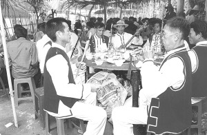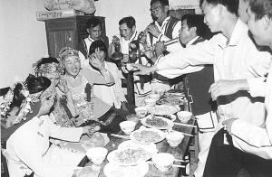 接著婚宴開始,八音隊(duì)吹奏的樂曲優(yōu)美動聽,大家喝喜酒祝賀新郎、新娘;同時,男方家的帶娘給女方家人開檳榔碗。開檳榔碗的順序是女方家人由老到小分別接檳榔碗,意在感謝女方長輩、親屬對新娘的養(yǎng)育之恩。