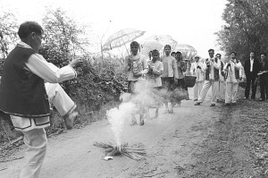 迎親隊(duì)伍出村口時要“過火堆”,求吉利
