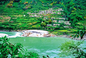 在怒江上游峽谷聚居的傈僳村寨都建在高山的半山上,其民居俗稱(chēng)為“千腳落地房”。說(shuō)“千腳落地”雖有些夸張,但也足以形象地說(shuō)明峽谷溫?zé)岬臍夂蚝蜕礁咂露傅牡乩項(xiàng)l件。在雨季時(shí),“千腳”阻力最小,使山洪順利傾瀉而下,又很快干爽,免受潮氣。而且不需挖地動(dòng)土,不必移石砌墻,對(duì)木料沒(méi)有過(guò)高要求,長(zhǎng)短皆用,在生態(tài)脆弱的高山峽谷也算環(huán)保建筑?!扒_落地”是因建房時(shí)先在確定的屋基上依斜坡程度和住房面積打進(jìn)數(shù)十根到百余根木樁為基樁,以保證居室樓板的平正?;鶚洞蚝煤?,除四面留幾根高柱作為整個(gè)房屋的立柱外,在密集木樁所形成的平面上滿鋪竹篾編織的樓板,還有竹篾圍墻,所有結(jié)構(gòu)皆用竹篾綁扎。屋頂鋪苫草或蓋木片瓦,近幾年,已陸續(xù)換上了大塊的水泥波形瓦。房門(mén)開(kāi)在山墻一側(cè),有廊道,可做曬臺(tái),平時(shí)穿的衣服都搭在這兒,也是婦女做針線活的地方。隨著怒江峽谷的開(kāi)發(fā)和新農(nóng)村建設(shè)的深入,通路的村寨將很快會(huì)改變面貌。