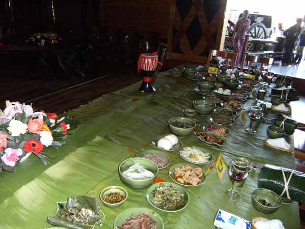 景頗族飲食大多帶有亞熱帶山林地區(qū)的特色和耕牧漁獵的民族文化氣息,如舂鱔魚、螺螄湯、酸筍燒魚、竹筒烤魚、砂鍋燉竹鼠、涼拌牛肚、煮芋頭、臭豆、酸木瓜炒牛肉絲、帕滾菜煮繁雞、水腌菜拌烤山鴿、鹿肉剁生、馬鹿干巴肉松、油炸知了肉丸、螃蟹夾、粘棗果、煮酸粑菜、軟米銅鍋飯等。特色菜酸筍燒魚烹飪時先將油燒至七成熱,放入洗凈去鰓的魚,炸至呈金黃色撈出控油。然后又在鍋中注入油,用蔥、姜、蒜熗鍋,烹入料酒、醬油、高湯,沸后下魚、酸筍、辣椒、味精、鹽、白糖、胡椒,收至汁濃時裝盤。舂鱔魚將鱔魚去頭去內(nèi)臟,蒜、姜拍松,香菜、荊芥切成末,鱔魚用炭栗火燒成金黃色,辣椒炒熟透,切成米粒。最后將鱔魚舂細(xì),放入配料,調(diào)料舂細(xì)裝盤。