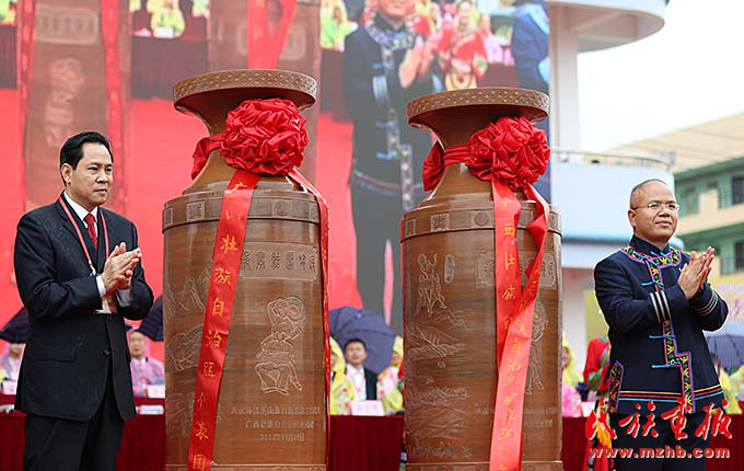 廣西壯族自治區(qū)代表團(tuán)向環(huán)江縣贈(zèng)送民族團(tuán)結(jié)寶瓶(左為廣西壯族自治區(qū)代表團(tuán)團(tuán)長(zhǎng),中共廣西壯族自治區(qū)黨委常委、政法委書(shū)記黃世勇,右為中共環(huán)江毛南族自治縣委書(shū)記黃榮彪)