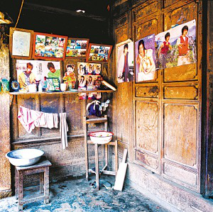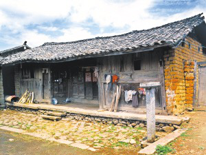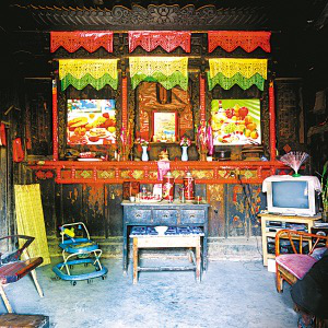 隴川縣戶撒鄉(xiāng)曼旦寨是阿昌族古老的村寨之一,明、清時期的老宅皆以楠木建造,數(shù)百年不朽、無蟲蛀。受漢族文化影響,傳統(tǒng)民居大都是土木石結構的三合一照壁或四合院落。正房建在長方石條加土方壘起的屋基上,屋基下為院壩,以三層石階上下。正房三開間,四排五柱,中柱起脊,形成雙斜面屋頂,上覆凹型青瓦。后墻和兩側山墻以土坯砌筑,外面不抹泥,左右是廂房或照壁。室內隔墻均為木板,中間一間為堂屋,有一米多寬的吞口,六扇雕刻的木板門,平時只開中間兩扇。兩邊的檐柱頭有粗獷的木雕。吞口有走廊的作用,一般左側角設臉盆架以供洗漱,板壁上掛小鏡框以便梳妝,旁邊掛著家人的照片。有的擺著縫紉機,有的放藤椅小憩。右側放臨時的農具,掛衣服,板壁上貼著影視明星的招貼畫。堂屋正面板壁是通高的木雕佛龕,供奉佛像和傣文的經文,龕楣上貼著三至四層掛錢,下面有燭臺、香爐。左側擺著電視機、熱水瓶、茶桌,板壁上掛著戶撒刀和手工編織的背兜,右側有專供老人休息的床或藤椅,也有的砌火塘,火塘的小土臺上放著炒菜的調料、火柴和照明燈具。