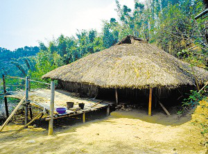 云南省潞西市三臺(tái)山鄉(xiāng)的德昂族居住分散,村寨很小,大都建在高半山上,山路行車?yán)щy。傳統(tǒng)住房為正方形干欄式竹木建筑,房屋兩層,為木柱結(jié)構(gòu)框架,竹篾編片圍墻,粗竹劈壓成自然的竹片做樓板,屋頂苫草排,當(dāng)?shù)厮追Q“草帽頂房?!?/p>