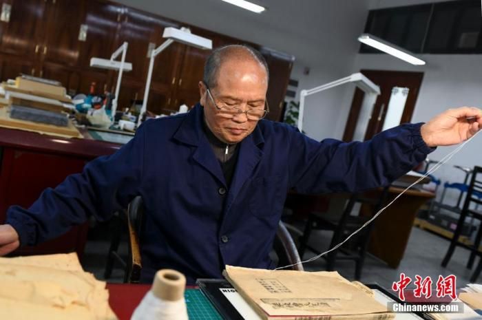 圖為師玉祥將修復(fù)完成的古籍進(jìn)行穿線訂書。 楊華峰 攝