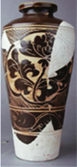 褐釉剔刻菊花紋經(jīng)瓶,高32厘米、口徑8.8厘米、底徑8.9厘米,三級(jí)文物。腹部四分葵口紋內(nèi)剔刻開光折枝菊花紋,花瓣細(xì)密舒展,四周花葉搖曳有動(dòng)感,開光外刻劃花葉紋和弧線紋。其下為兩組雙線弦紋,施褐釉。殘存肩及腹部一半,其余為后修復(fù)。