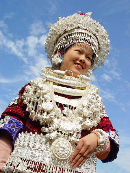 銀飾作為苗族最喜愛的傳統(tǒng)飾物,主要用于婦女的裝飾,品種多樣,分為頭飾、面飾、頸飾、肩飾、胸飾、腰飾、臂飾、腳飾、手飾等,彼此配合,體現(xiàn)出完美的整體裝飾效果。苗族銀飾常出現(xiàn)于苗族的喜慶場合,蘊涵有避邪趨正、納福迎祥的寓意,具體生動地反映著苗族人民的生存狀況、精神面貌和審美心理,具有很高的歷史文化研究價值。在對外交往中,苗族人民把銀飾作為禮品贈送友人,和藏族的哈達(dá)、漢族的珠寶一樣珍貴。