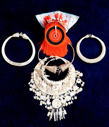 苗族銀飾制作精巧,花樣古樸,富有想象力,且種類繁多,主要有銀角、銀冠、銀項圈、圍腰鏈、銀手鐲、銀衣片等100多種。即使同一品種,紋飾也各有千秋。