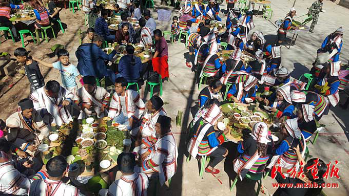 “過去過節(jié),手頭拮據(jù),經(jīng)常是三五戶人家湊錢殺一頭豬。由于物質(zhì)匱乏,節(jié)日前,男女老幼都上山挖野菜,殺豬當(dāng)天,到地里砍芭蕉花,帶上柴火去寨老家里煮年飯吃,節(jié)日第三天去寨老家唱歌跳舞?!?記者聆聽著87歲基諾族老人周白講述基諾山寨的回憶。如今的他已是四世同堂,在耄耋之年能享受天倫之樂,過上幸福生活,他心存感激。節(jié)日當(dāng)天老人們在村委會(huì)聚餐,席間接受年輕人的敬酒與祝福,其樂融融。