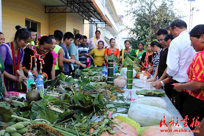 尚立文向記者介紹說:“以前景頗族過年,大年三十,一部分男人在家殺年豬,其余的就上山打獵。景頗族很慷慨,凡是獲取到的獵物,見者都有份。女人除了在家準(zhǔn)備年夜飯,也會(huì)上山或下壩子采野菜等。但不管是打獵的還是摘野菜的,都必須在太陽落山前到家,闔家歡度春節(jié)吃年夜飯?,F(xiàn)在生活好了,不打獵不摘野菜了,但還是得遵循太陽落山之前到家的習(xí)俗?!?/p>