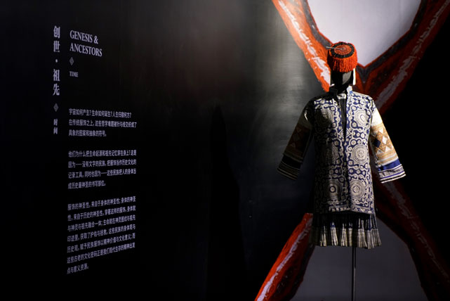 展覽呈現(xiàn)了在傳統(tǒng)服飾中,這些哲學(xué)難題被針與線在不同歷史時期交織成具象圖案和抽象符號——對于創(chuàng)世與祖先,對于人與神、天與地,傳統(tǒng)服飾成為苗、瑤、彝、侗等民族書寫與描摹的材料;服飾之上精美的紋飾,展現(xiàn)出這些民族心中神靈的形象,勾畫出民族英雄的事跡,從而建立起關(guān)于自我認識的圖景,生發(fā)出對宇宙的敬畏。
