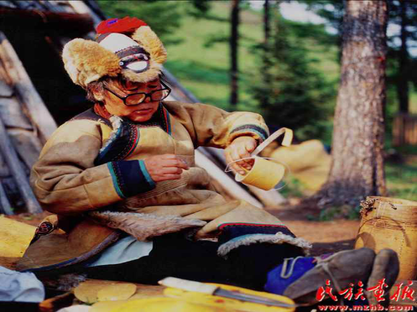 由于鄂倫春族生活在北半球高寒地帶,一年冰雪期長(zhǎng)達(dá)7個(gè)月,最低氣溫可達(dá)零下45度以下,所以他們的服飾首先要解決御寒問(wèn)題。另外,鄂倫春長(zhǎng)期游獵于山林之中,追逐獐狍野鹿、翻越崇山峻嶺都要求他們服飾結(jié)實(shí)耐磨。獸皮滿足了保暖與耐用這兩個(gè)條件。狍皮服飾在鄂倫春服飾中所占比重最大,這一方面是因?yàn)樵诙鮽惔荷畹牡赜蚺圩拥臄?shù)量很多,“傻”狍子又很容易獵獲,另一方面也是因?yàn)橛门燮ぶ谱鞯姆棞嘏⑷彳?。與現(xiàn)代人穿皮草時(shí)的“毛朝外”不同,從御寒性考慮,鄂倫春人的皮袍永遠(yuǎn)是“毛朝里”。動(dòng)物的皮經(jīng)過(guò)加工以后,如果不加任何的漂白劑,皮子就會(huì)泛黃,再經(jīng)過(guò)日曬,黃色會(huì)越來(lái)越深。鄂倫春婦女在制作色彩鮮艷的婚服和節(jié)日服裝時(shí),她們會(huì)特意用朽柞木煮水,將皮子染成黃色,然后在襟口、袖口、前胸和后背縫上繡有云紋、植物紋和各種動(dòng)物圖案的繡片。鄂倫春男子愛(ài)戴用狍頭皮縫制而成的狍頭帽,這種帽子用狍子本來(lái)的黃色皮毛,有的還將兩只角保留下來(lái)。獵人打獵的時(shí)候,微露狍頭帽,儼然像一支狍子臥在那里,誘惑狍子或其他以狍子為獵食對(duì)象的野獸,具有很高的欺騙性。此外,鄂倫春族信仰薩滿教,薩滿服是用黃色鹿皮制作的,再加上黃色銅鏡,整套薩滿服給人的感覺(jué)以黃為主。