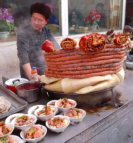 新疆盛產(chǎn)牛羊,是我國主要畜牧業(yè)基地之一。信仰伊斯蘭教的民族以食牛羊肉為主。牛羊肉風味小吃名類繁多自不待言,就是以羊的內(nèi)臟作原料,也能烹制出鮮香異常的美味來。米腸子與面肺子便是其中的代表。