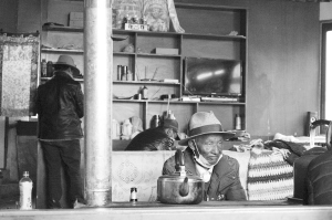 一個(gè)藏族老大爺坐在火爐邊,不言不語(yǔ),與茶館熱鬧的景象形成鮮明對(duì)比。