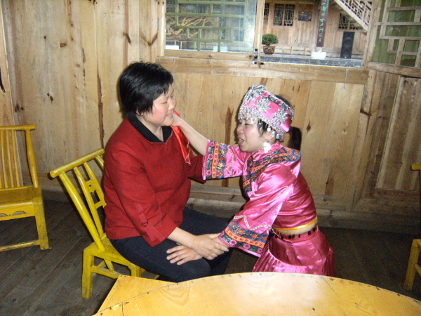 哭嫁歌內(nèi)容有“母女對哭”“嫂妹對哭”“姐妹對哭”“哭離娘席”“哭別祖宗”“哭兄弟”“哭梳頭”“罵媒人”“哭上轎”等,甚至還有同村同齡未婚姑娘的群哭——“哭十姊妹”??藜薷柙从谕良易骞媚锍黾耷暗目藜拗?,越是臨近婚期,哭聲越悲,甚至通宵達旦。2010年,“土家族哭嫁歌”已被列入第三批國家級非物質(zhì)文化遺產(chǎn)名錄。