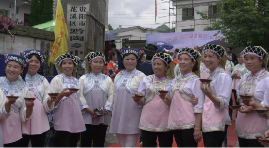 布依族青年們抬著族中神物銅鼓,吹著長長的號角,臉上滿是對民族節(jié)日的期待之情,驕傲又興奮;成群結(jié)隊的孩童穿著本民族傳統(tǒng)服飾,手拿錦帶,熱忱歡迎遠道而來的客人;能歌善舞的布依阿姐笑臉相迎,唱著布依族的歌謠,一字排開堵在門前,客人們想要進去參加這次盛會,就得過三關,干了三碗攔路酒。