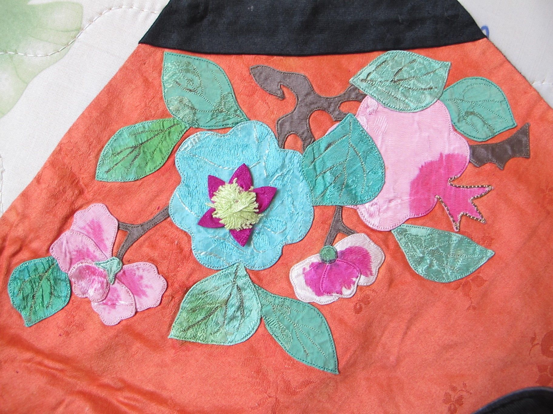 第四步是刺繡。機(jī)繡作品雖然操作簡(jiǎn)便,速度快,工作效率高,但由于不能隨時(shí)調(diào)換粗細(xì)不同的機(jī)針或不同顏色的機(jī)線,圖案比較簡(jiǎn)單,繡法也不能象手工繡那樣靈活多變,所以東鄉(xiāng)族婦女對(duì)能充分施展本領(lǐng)的手工繡情有獨(dú)鐘。